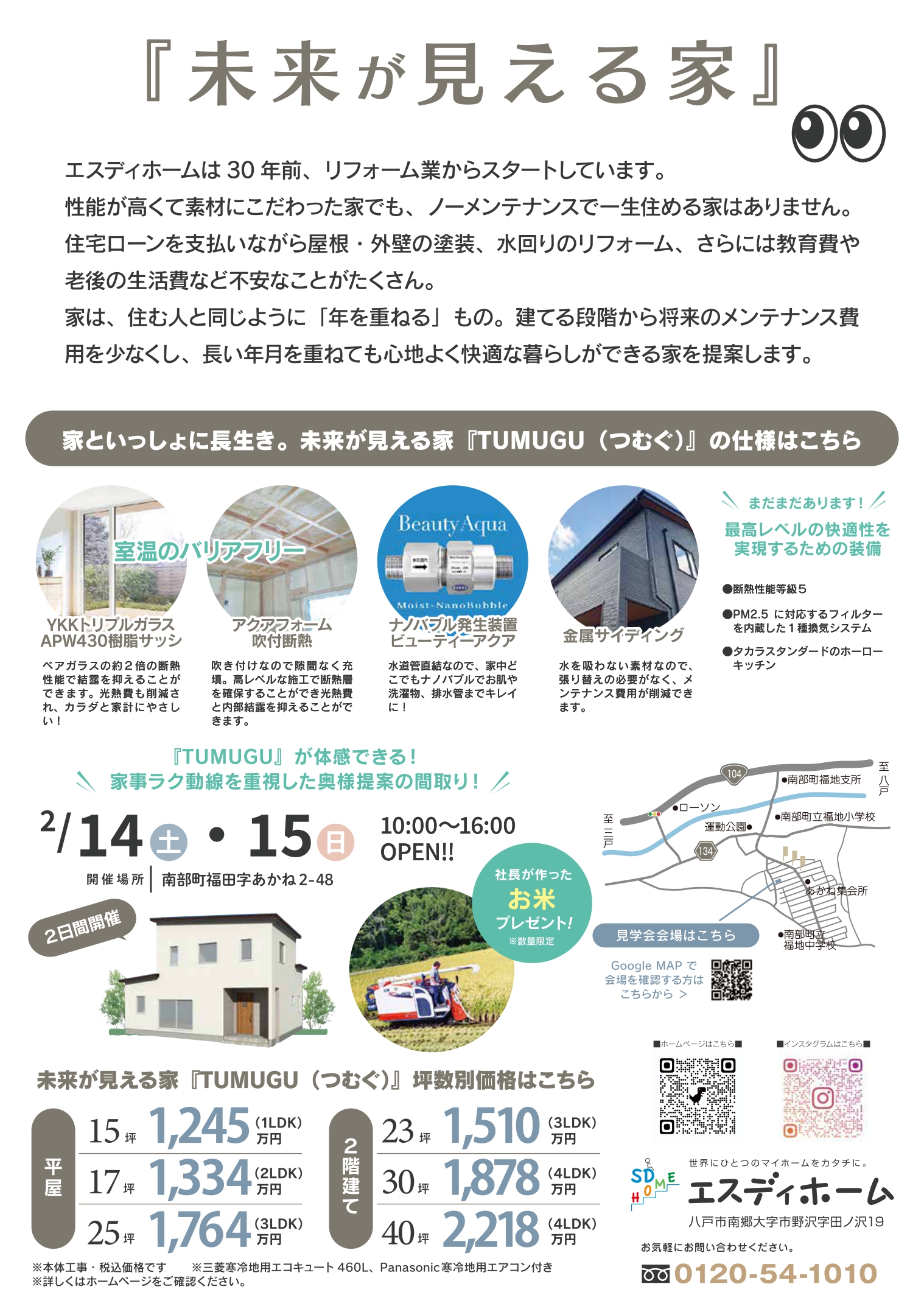 2/14(土)・2/15(日)、南部町あかねにて完成見学会を開催いたします